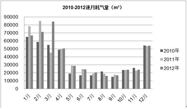 - 上图是根据物业方所提供的过去3年自行记录并留档的逐月用气耗量明细及账单所绘制,由于本建筑的用气量包括厨房用气及燃气锅炉用气,其中,厨房用气量比较稳定,而锅炉用气量与气象参数有关,其中2012年3月用气量较高,这是由于2012年3月的气温与其他两年相比较低,所以空调燃气使用量有所增加,另外3月酒店生意也比2011年同期要好,厨房用气量也有所增加,由此导致3月的用气量较高。