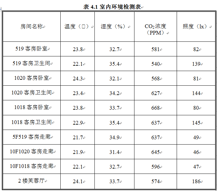 - 对本建筑不同功能房间抽取了3间进行了室内空气质量检测(室内温度、湿度;CO2浓度;照度),测试当天天气晴,室外环境温度9.6℃,相对湿度41.7%。检测结果见表4.1。