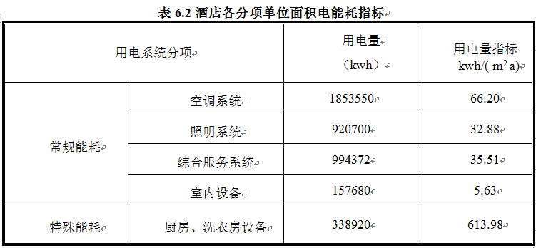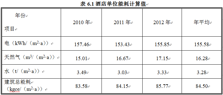 - 本次能源审计通过对该酒店用能管理,能耗现状,能源计量及统计,主要用能设备,已有节能措施及下一步节能计划等各个环节的现场调查、信息核对、专项检测及分析计算,得到审计结论如下汇总于表格中,详细情况见表6.1、表6.2。
